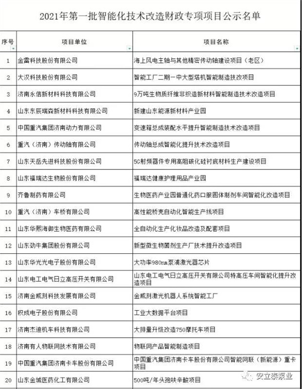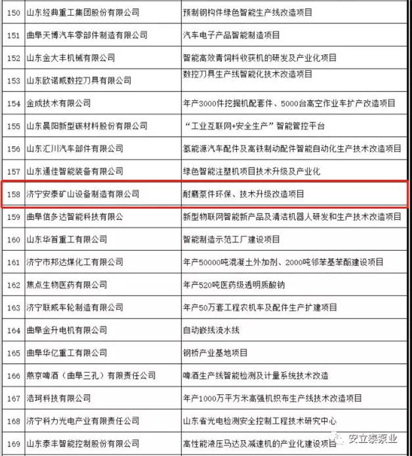 濟寧安(ān)泰礦山設備製(zhì)造有限公司(簡稱安泰泵業)經企業申報、各市推(tuī)薦、專(zhuān)家(jiā)評審等環(huán)節,入選列入2021年第一批智能化技術改(gǎi)造財政專項項目(mù)名單,公示時間(jiān)為(wéi)2021年10月11日-15日(5個工作日)。